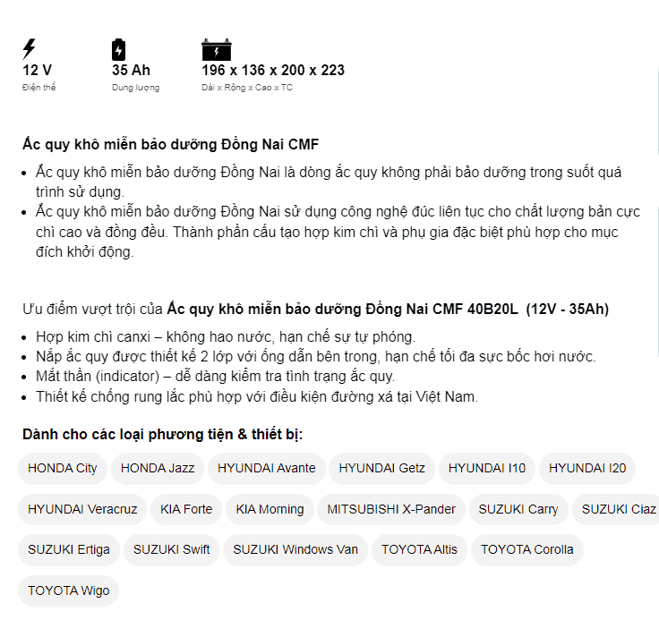 Dòng CMF là ắc quy miễn bảo dưỡng (ắc quy khô, kín) của Đồng Nai đảm bảo về chất lượng cũng như giá thành sản phẩm. Ắc quy làm từ hợp kim chì canxi có bổ sung thiếc, bạc nhập khẩu từ Úc nên không hao nước, hạn chế sự tự phóng điện. Nắp bình được thiết kế 2 lớp với ống dẫn bên trong, giúp giảm tối đa sự bốc hơi nước. Trong bình trang bị bộ phận lọc chống bắt lửa – an toàn khi sử dụng và Indicator (mắt thần) – dễ dàng kiểm tra tình trạng ắc quy.