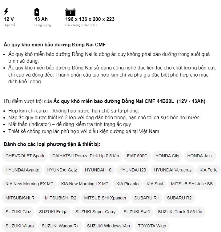 Dòng CMF là ắc quy miễn bảo dưỡng (ắc quy khô, kín) của Đồng Nai đảm bảo về chất lượng cũng như giá thành sản phẩm. Ắc quy làm từ hợp kim chì canxi có bổ sung thiếc, bạc nhập khẩu từ Úc nên không hao nước, hạn chế sự tự phóng điện. Nắp bình được thiết kế 2 lớp với ống dẫn bên trong, giúp giảm tối đa sự bốc hơi nước. Trong bình trang bị bộ phận lọc chống bắt lửa – an toàn khi sử dụng và Indicator (mắt thần) – dễ dàng kiểm tra tình trạng ắc quy.