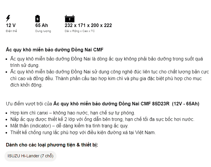 Dòng CMF là ắc quy miễn bảo dưỡng (ắc quy khô, kín) của Đồng Nai đảm bảo về chất lượng cũng như giá thành sản phẩm. Ắc quy làm từ hợp kim chì canxi có bổ sung thiếc, bạc nhập khẩu từ Úc nên không hao nước, hạn chế sự tự phóng điện. Nắp bình được thiết kế 2 lớp với ống dẫn bên trong, giúp giảm tối đa sự bốc hơi nước. Trong bình trang bị bộ phận lọc chống bắt lửa – an toàn khi sử dụng và Indicator (mắt thần) – dễ dàng kiểm tra tình trạng ắc quy.
