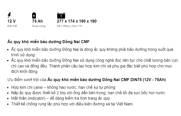Dòng CMF là ắc quy miễn bảo dưỡng (ắc quy khô, kín) của Đồng Nai đảm bảo về chất lượng cũng như giá thành sản phẩm. Ắc quy làm từ hợp kim chì canxi có bổ sung thiếc, bạc nhập khẩu từ Úc nên không hao nước, hạn chế sự tự phóng điện. Nắp bình được thiết kế 2 lớp với ống dẫn bên trong, giúp giảm tối đa sự bốc hơi nước. Trong bình trang bị bộ phận lọc chống bắt lửa – an toàn khi sử dụng và Indicator (mắt thần) – dễ dàng kiểm tra tình trạng ắc quy.