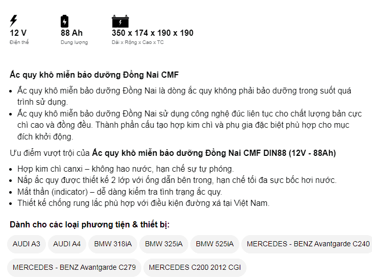 Dòng CMF là ắc quy miễn bảo dưdỡng (ắc quy khô, kín) của Đồng Nai đảm bảo về chất lượng cũng như giá thành sản phẩm. Ắc quy làm từ hợp kim chì canxi có bổ sung thiếc, bạc nhập khẩu từ Úc nên không hao nước, hạn chế sự tự phóng điện. Nắp bình được thiết kế 2 lớp với ống dẫn bên trong, giúp giảm tối đa sự bốc hơi nước. Trong bình trang bị bộ phận lọc chống bắt lửa – an toàn khi sử dụng và Indicator (mắt thần) – dễ dàng kiểm tra tình trạng ắc quy.