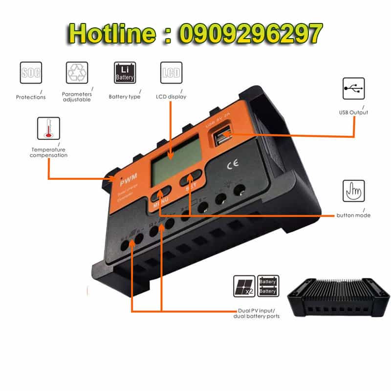 – Điện áp định mức: Tự động 12V/24V – Điện áp tối đa PV: <50V – Dòng tải: 60A – Công suất: hệ 12V – 720W ~ hệ 24V: 1440W – Hiệu suất: >90% – Đầu ra USB: 5V/2A*2 – Nhiệt độ làm việc: -15 ~ + 50°C – Kích thước: 175 * 118 * 44mm – Trọng lượng: 438g. |